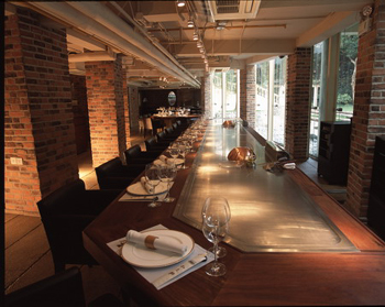 各种风味餐厅的VI设计风格应该以其风格迥异、鲜明的地方性特征。如广东餐厅应突出热带气氛,上垂吊兰,下置盆栽,墙面及家具均以绿色为主调,加以东南两面外窗竹帘低垂,凸显南国意境。淮扬餐厅的格调应以端庄为宜,不等边六角形平面的周边布置固定的小餐位,围绕中心两组大圆桌;顶棚上相应悬挂两组晶体吊灯,光彩照人,厅内鲜花盛开,香气袭人;地面、墙面及家具均用暖色调,烘托出江淮的情调。如图1-4为风味餐厅设计效果图。