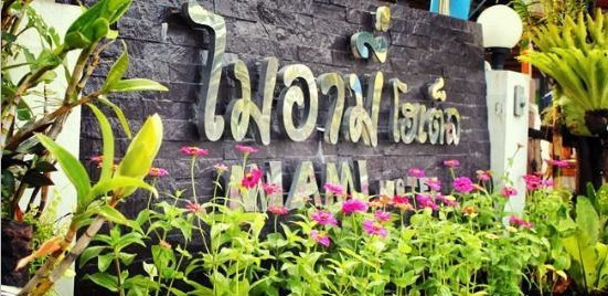 一块户外环境区域形象标识牌设计欣赏,字体与色彩的设计统一和谐,采用黑色为标牌底色,摆放了花草树木为形象标识增加色彩,在环境中将标牌整体显得丰富多彩,很有活力。