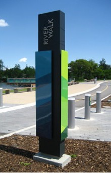 户外立式形象标识牌的风格设计欣赏,标牌的整体色彩搭配设计很时尚、具有很强的视觉冲击感。