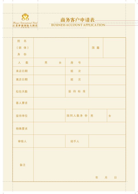 这张是江苏梦溪国际大酒店的商务客户申请表,表上的设计内容分别有姓名、团体、身份、国籍、人数、男、女、房号等等的入店信息(详细信息可以图上的样式表)。