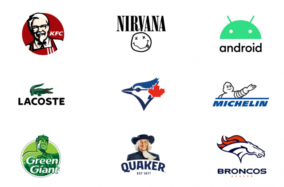 吉祥物徽标示例包括:肯德基、涅盘、Android、拉科斯特、多伦多蓝鸟队、米其林、绿巨人、贵格会和丹佛野马队。