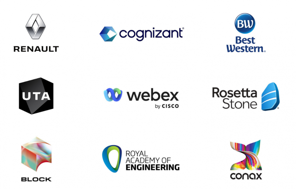 3D 徽标的示例包括:Renault、Cognizant、Block、Webex、Best Western、Rosetta Stone、UTA、Royal Academy of Engineering 和 Conax。