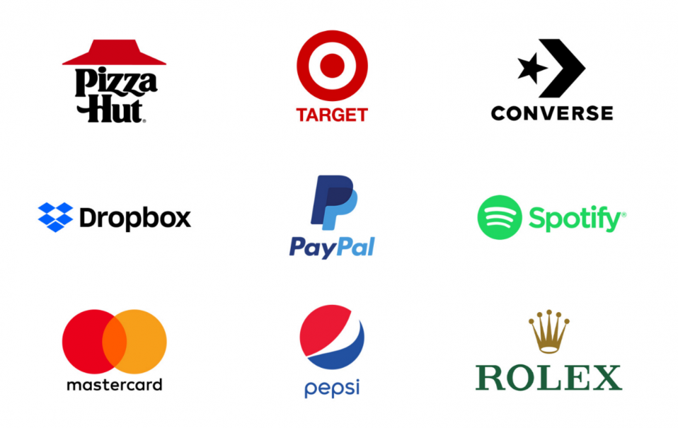 组合商标标识的示例包括:必胜客、塔吉特、匡威、Dropbox、贝宝、Spotify、万事达卡、百事可乐、劳力士。