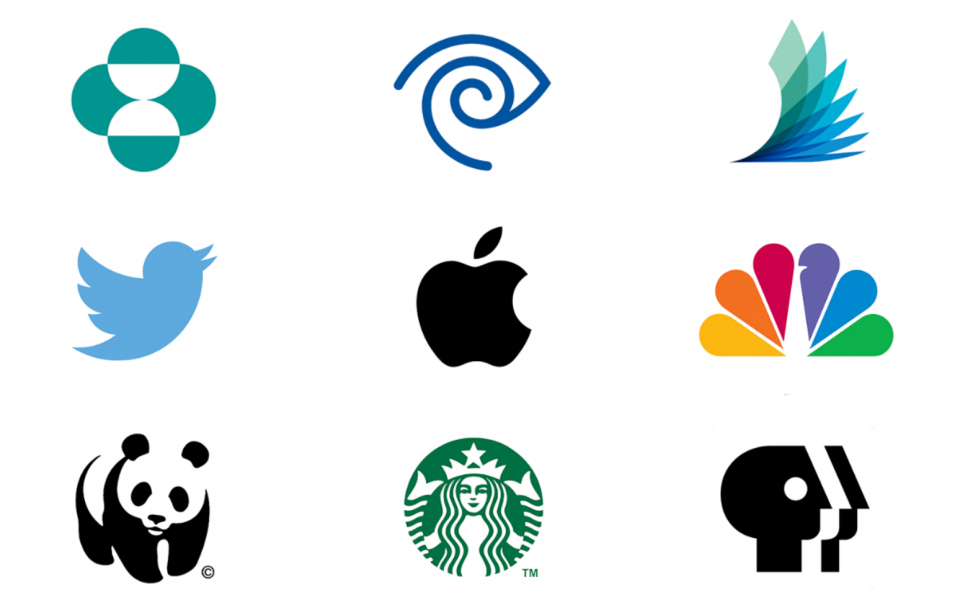 抽象徽标的示例包括:Merck Sharp & Dohme BV、时代华纳有线、Darien Library、Twitter、Apple、NBC、世界野生动物基金会、星巴克和 PBS。